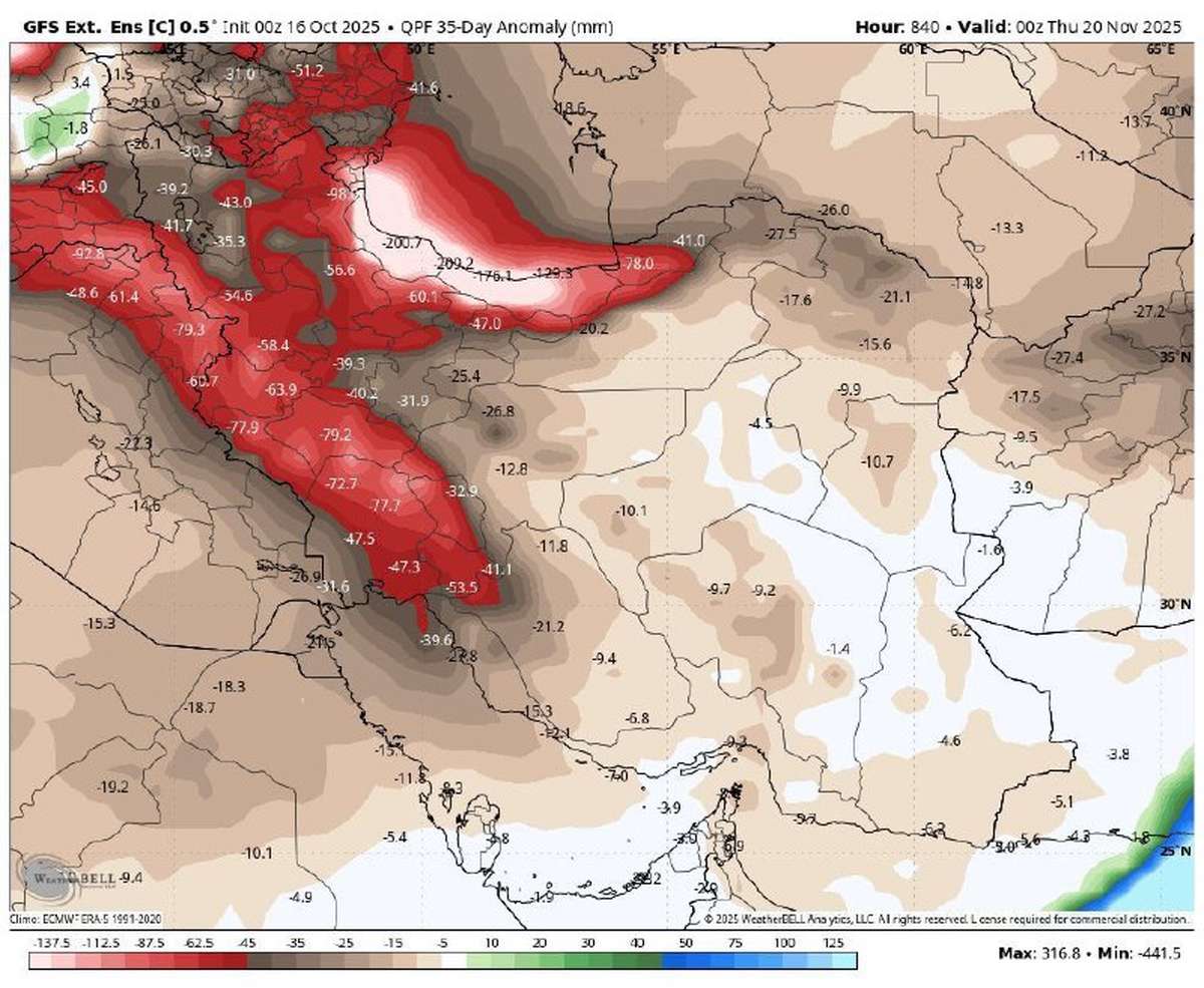 بر اساس دادههای مدل ECMWF و GFS، در این بازه زمانی (از ۲۵ مهر تا پایان آبانماه ۱۴۰۴) میانگین بارش کل کشور حدود ۴۰ تا ۶۵ درصد کمتر از نرمال بلندمدت خواهد بود.